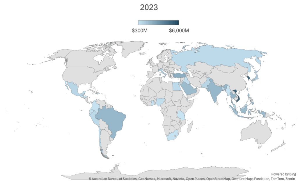 Figure 2: Growth in China’s unfinished steel exports by country, 2018- 2023.