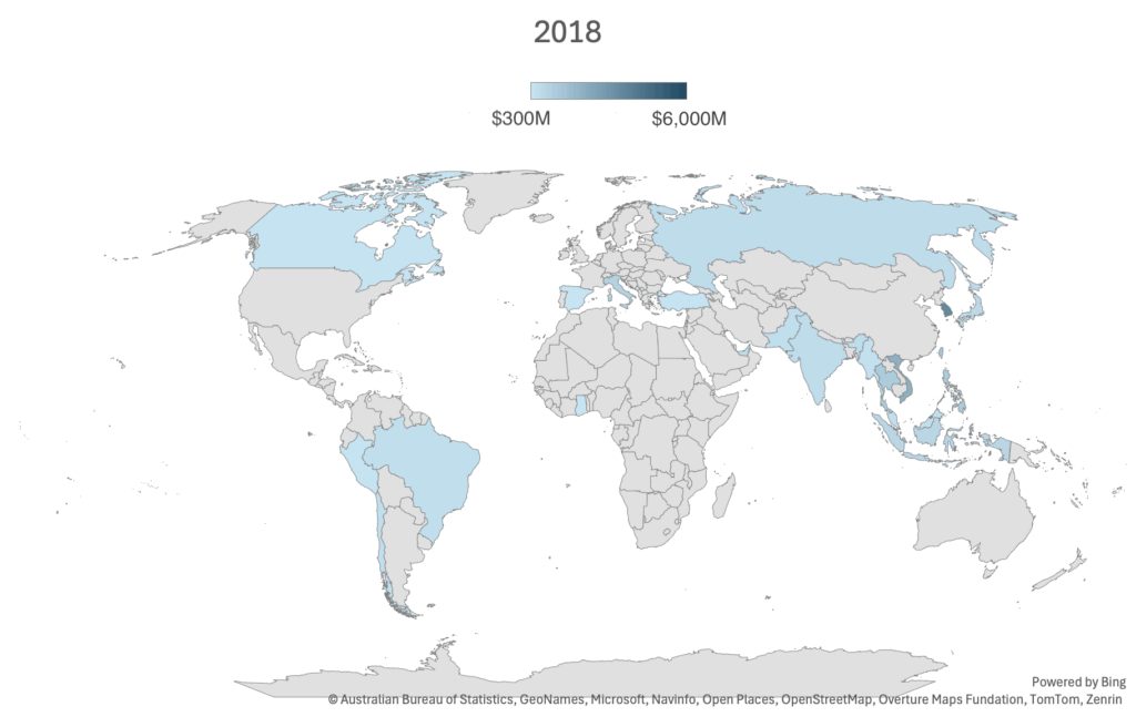 Shading reflects each country’s net imports of unfinished steel from China. Maps include only countries that imported over $300 million of unfinished steel from China in each year.
