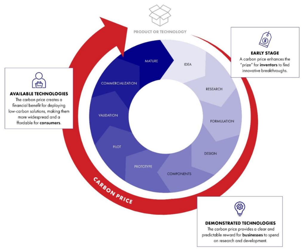 To get undiscovered climate solutions into research, development, and eventual mass commercialization, there must be a significant pull to innovate. A carbon price presents an opportunity to significantly accelerate the innovation and deployment required to respond to climate at the required scale and speed. It would provide a financial incentive to drive clean energy concepts all the way through the invention-deployment continuum from ideas to widely available commercialized products.