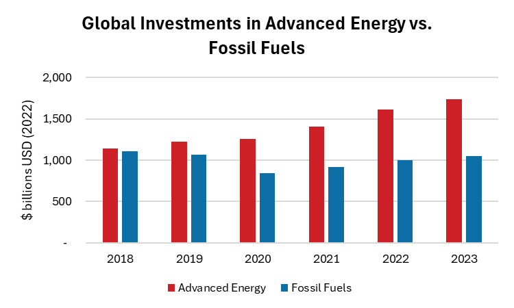 The context of China’s ascendance as an energy and energy technology export superpower is straightforward: global energy investment trends are shifting rapidly to areas of Chinese dominance. In 2018, worldwide investments in advanced energy and fossil fuels were virtually even. Over the next five years, however, investments in advanced energy increased by 53% whereas those in fossil fuels decreased by 5%. While fossil fuel investments still play a significant role in the global economy, the worldwide market for advanced energy investments is now more than 65% larger than the market for fossil fuel investments and is growing rapidly.