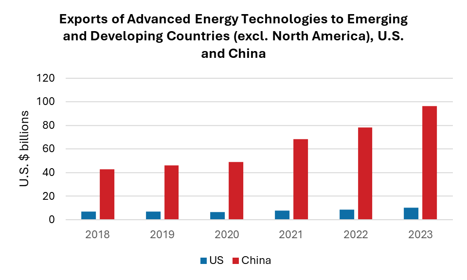 As the global economy shifts to advanced energy solutions, China is enjoying the pole position. Between 2018 and 2023, Chinese exports of advanced energy technologies to emerging economies increased by $54 billion, or 125%, to $96 billion. Over the same period, American exports of the same goods increased by just $3.3 billion to $10 billion.