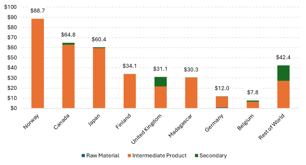 Norway, Canada, and Japan account for a combined 58% of U.S. cobalt imports. U.S. industry imports mostly intermediate products and secondary materials, reflecting the prominent position of American firms in the manufacture of more mature goods, like cobalt-based machine parts.