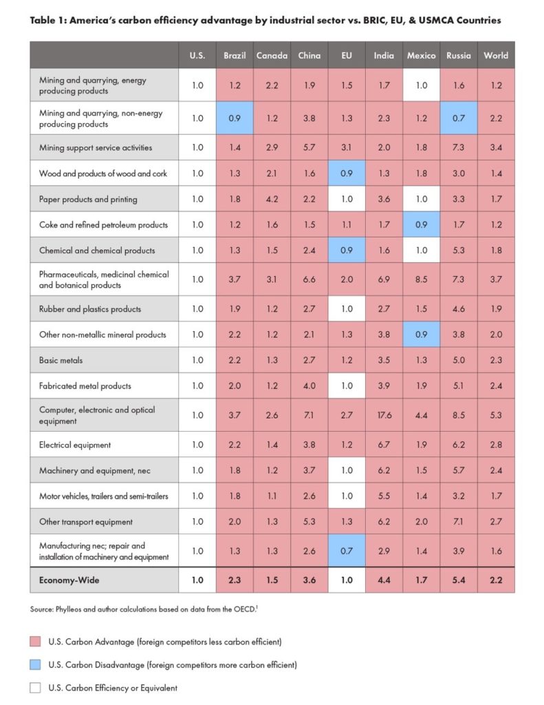 - Red values (greater than 1.0) indicate sectors where the U.S. produces the same value of products with fewer emissions than competing economies, highlighting a clear carbon advantage.