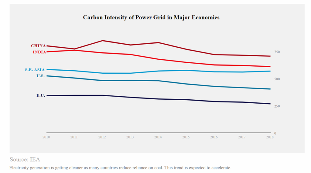Another significant factor is that the U.S. has access to abundant domestic natural resources to support and fuel the domestic economy. For example, U.S. natural gas has become the largest source of energy for America’s power sector, rapidly displacing coal. Since natural gas is about half as carbon intensive as coal, this displacement has contributed to a 20% drop in U.S. emissions since 2005, according to the Environmental Protection Agency. Finally, the U.S. benefits from a cleaner electricity grid. The share of electricity generated from carbon-free energy is far higher in the U.S. than in many major economies: in 2021, 80% of new grid capacity came from renewable sources. This trend is bound to continue with renewable energy sources receiving an influx of new investments through the Infrastructure Investment and Jobs Act, the Inflation Reduction Act, and other regional policies. Many of these investments also provide support for nuclear energy, now the largest source of carbon-free electricity in the U.S. Furthermore, various states have implemented mandates to achieve 100% carbon-free electricity generation in the coming decades.