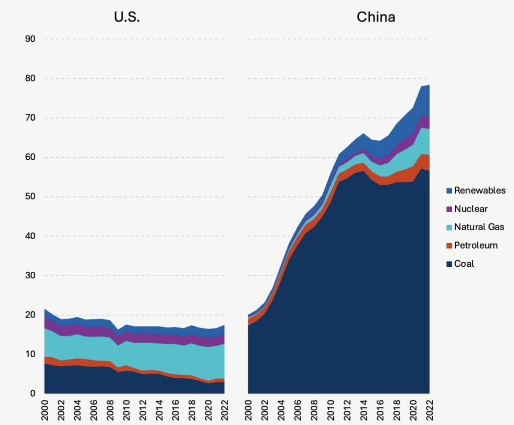 The growth in the Chinese industrial sector over the past 25 years has been fueled by a colossal increase in fossil fuel consumption – especially coal. The chart shows the primary energy inputs to the U.S. and Chinese industrial sectors, including direct fuel use at facilities, and the implied share of primary energy inputs to power generation to meet industrial load.i