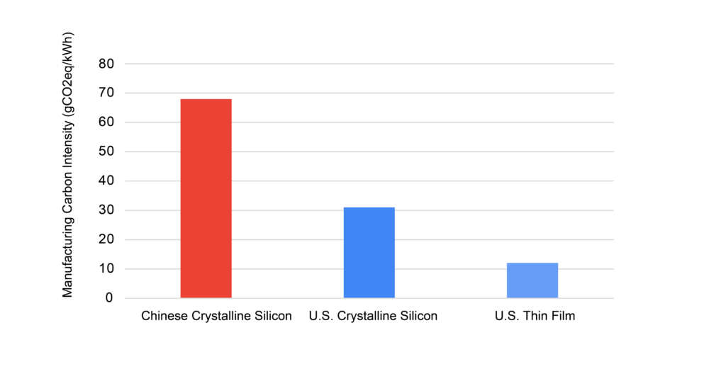 China’s solar industry is more carbon intensive because it relies mainly on coal-fired electricity for energy-intensive processes like silicon refining. In Europe and the U.S., the power grids are notably cleaner. Likewise, other inputs China uses in solar panels, such as steel, aluminum, and glass, are more carbon-intensive than those sourced by U.S. solar producers. China’s largest province, Xinjiang, is particularly known for its cheap, coal-powered solar manufacturing industry, which has also raised ethical flags for its labor practices.
