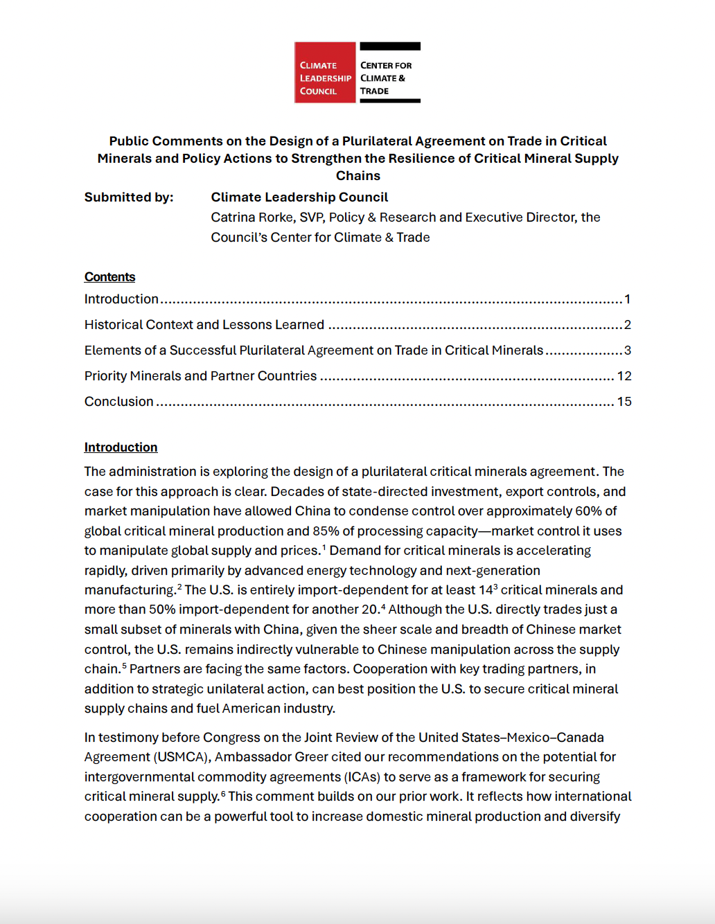 Public Comments on the Design of a Plurilateral Agreement on Trade in Critical Minerals