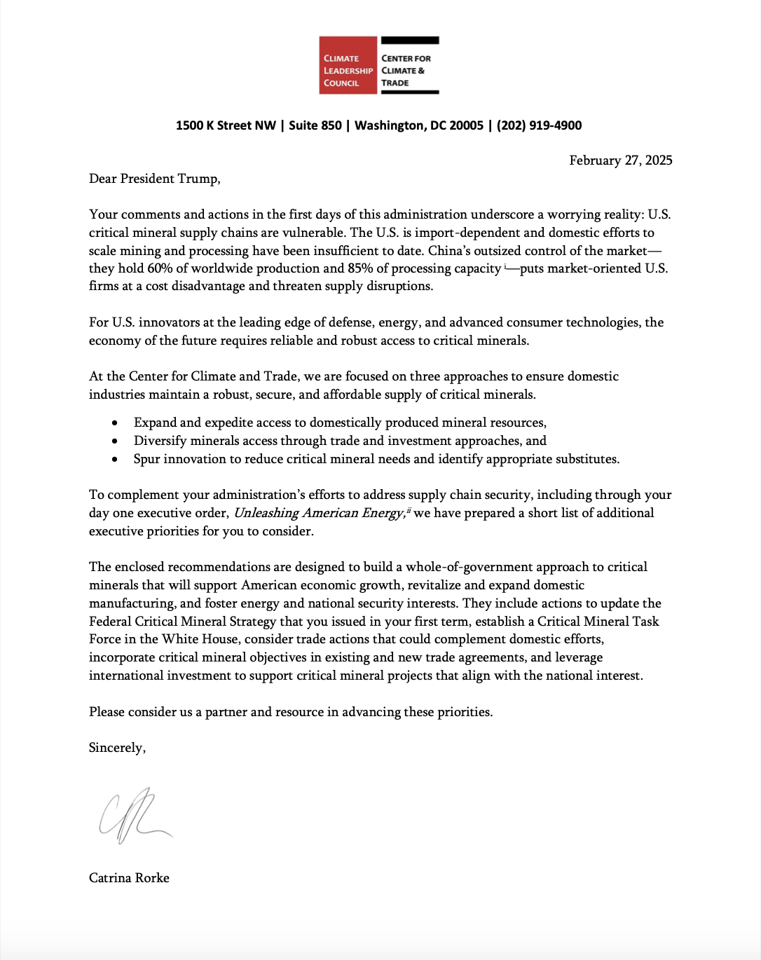 In this letter to President Trump, Senior Vice President of Policy and Research Catrina Rorke outlines recommendations that are designed to build a whole-of-government approach to critical minerals that will support American economic growth, revitalize and expand domestic manufacturing, and foster energy and national security interests.