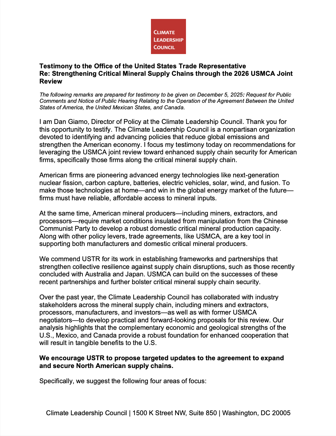 Ahead of the upcoming 2026 USMCA joint review, the Council’s Dan Giamo testified before the Office of the United States Trade Representative on our recommendations for strengthening North American critical mineral supply chains.